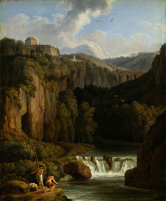 Der aus dem brandenburgischen Prenzlau stammende Hackert vermittelte die Italiensehnsucht durch seine Gemälde, die ihn zu einem gefragten Landschaftsmaler der Zeit werden ließen. Hier gibt er eine verdichtete Perspektive des tiefen Tals der Treia mit den schroffen Steilwänden, der dahinter liegenden Ponte Clementino und der Forte Sangallo in Civita Castellana nördlich von Rom wieder. Seine Natureindrücke der unmittelbaren Realität setzte er in ideale und erhabene Bildkompositionen um.