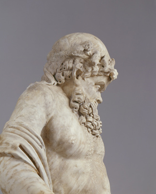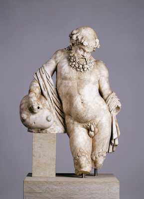 Wieder einmal hat der glatzköpfige Silenos im Übermaß seinem Lieblingsgetränk, dem nicht mit Wasser gestreckten Wein, zugesprochen. Schwer wie Blei ist sein Kopf nach vorn gesackt und Silenos würde wohl im nächsten Moment umfallen, wenn er nicht gerade noch ein Felsstück erreicht hätte, das ihm Halt bietet und außerdem die Gelegenheit gibt, auch seinen immer noch mit mehreren Litern Wein gefüllten Schlauch abzulegen. „Ein vortreffliches Bild eines Gewohnheitstrinkers“ ( Paul Herrmann, 1915 ).