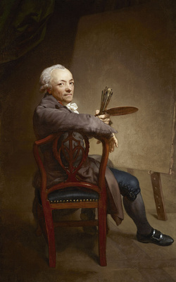 Rund 80 Selbstbildnisse sind von dem Dresdner Hofmaler Graff bekannt. Hier zeigt er sich im mittleren Alter in einem einfach eingerichteten Raum. Nur die grüne Draperie im Hintergrund lässt ahnen, dass er mittlerweile ein äußerst begehrter und erfolgreicher Porträtist ist. Ungewöhnlich ist die Hinwendung des sitzenden Künstlers über die Stuhllehne zum Betrachter, den er genau zu beobachten scheint. Seine Augen erweisen sich als ebenso essentielle Werkzeuge wie Farbpalette und Pinsel.