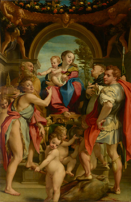 Die Altartafel entstand für die Bruderschaft San Pietro Martire in Modena. Der Hauptheilige, rechts neben dem Thron, spricht mit Maria. Vor ihm ist der hl. Georg platziert. Einige Putti spielen mit seinen Waffen, mit denen er den Drachen tötete. Links weist Johannes der Täufer zum Jesuskind, dem der Bischof Geminianus ein Stadtmodell von Modena zeigt. Alle Figuren agieren lebhaft miteinander. Die Emotionalität der Personen wie die Geziertheit ihrer Posen weisen auf die neue Epoche des Manierismus hin.