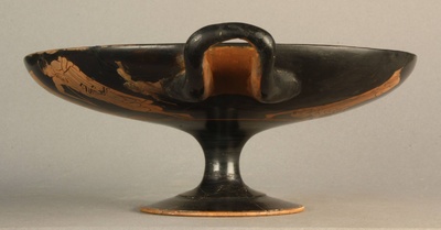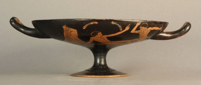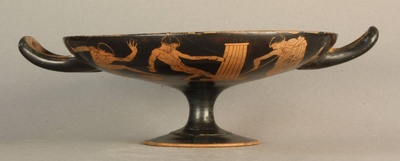 Auf den flachen Schalen sind Szenen aus der Palaistra dargestellt. Wir sehen nackte, mit Öl eingeriebene Sportler. Die Palaistra, die Ringschule, können Sie sich als einen quadratischen Sportplatz mit etwa 90 Metern Seitenlänge vorstellen; zur Palaistra gehörten verschiedene Übungs- und Aufenthaltsräume. Zusammen mit der Laufbahn, dem Dromos, bildete sie das Gymnasion und war nicht nur sportliche und militärische Ausbildungsstätte, sondern auch ein Ort humanistischer Bildung und Erziehung.