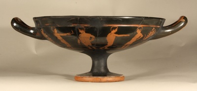 Auf den flachen Schalen sind Szenen aus der Palaistra dargestellt. Wir sehen nackte, mit Öl eingeriebene Sportler. Die Palaistra, die Ringschule, können Sie sich als einen quadratischen Sportplatz mit etwa 90 Metern Seitenlänge vorstellen; zur Palaistra gehörten verschiedene Übungs- und Aufenthaltsräume. Zusammen mit der Laufbahn, dem Dromos, bildete sie das Gymnasion und war nicht nur sportliche und militärische Ausbildungsstätte, sondern auch ein Ort humanistischer Bildung und Erziehung.