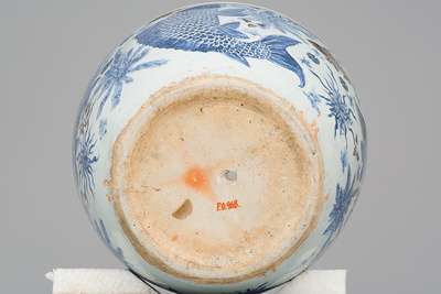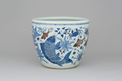 Auf diesen Gefäßen schwimmen verschiedene Fische und Krebstiere zwischen Wassergras herum. Die Unterglasurbemalung in Kobaltblau und Kupferrot ist nuancenreich und lebhaft. In solchen Bassins wurden in China Zierfische gehalten.