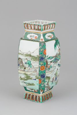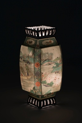 Diese Laterne, die um 1728 in Meissen nach einem chinesischen Vorbild gefertigt wurde, ist eine wunderbare Arbeit. Aber leider viel zu dickwandig, um als Laterne zu funktionieren. Die durchscheinenden Wände des chinesischen Originals sind dagegen so hauchdünn und zart, dass es an ein Wunder grenzt, dass sie überhaupt gebrannt werden konnte. Wenn Sie ganz genau hinschauen, erkennen Sie vielleicht auf dem Blatt Papier, das der Chinesenjunge in den Händen hält, das Monogramm des Meissener Malers Johann Ehrenfried Stadler.
