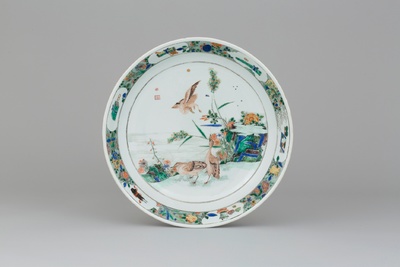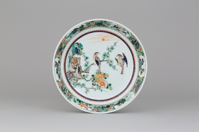 Jeder einzelne dieser vierzehn Teller an der Wand ist ein Meisterwerk chinesischer Porzellanmalerei aus der Zeit um 1700. Dem vorherrschenden grünen Farbton in facettenreichen Nuancen verdankt dieser Dekortyp die Bezeichnung „Famille Verte“, „Grüne Familie“. Die Meisterschaft der Feinmalerei und der raffinierten Bildkomposition macht diese Stücke zu technischen und künstlerischen Höhepunkten unserer Ostasien-Sammlung.