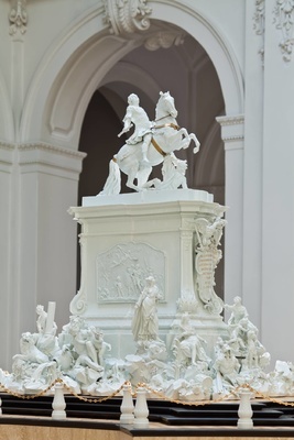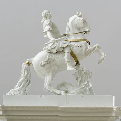 Johann Joachim Kaendler arbeitete an einem überlebensgroßen Reiterstandbild Augusts III., ein monumentales Porzellanbildwerk, das in Anspruch und Ausmaß alles bisher Dagewesene bei weitem übertreffen sollte. Um dem König eine Vorstellung zu geben, fertigte Kaendler 1753 zunächst ein Modell in wesentlich kleineren Abmessungen. Den Sockel schmücken figürliche Darstellungen der Herrschertugenden, wie Gerechtigkeit, Glaube, Hoffnung, Liebe – eben das, was einen guten Regenten ausmacht. Der Siebenjährige Krieg vereitelte den ehrgeizigen Plan und es blieb bei dem Modell.
