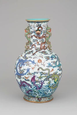 Die mit Drachen bemalte Vase wurde für den Hof des Kaisers Qianlong gefertigt. Solch prächtige, mit kaiserlichen Symbolen bemalte Vasen dienten als Ehrengeschenke für hochrangige Würdenträger.