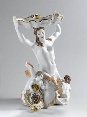 Der Zweite Weltkrieg hatte auch für das Schwanenservice Folgen. Das Service wurde teilweise zerstört und durch Plünderungen des Familiensitzes der Brühls in der Niederlausitz, Schloss Pförten, in alle Welt verstreut. Die Stücke aus dem Dresdner Kunstgewerbemuseum waren zum Glück in zwei großen Kisten ausgelagert worden. Sie kamen nach Kriegsende halbwegs unversehrt nach Dresden zurück. Nur neun Stücke aus diesem Ensemble gingen verloren. Dazu gehörte zum Beispiel die große Meeresnymphe rechts oben, die auf ihrem Kopf eine Schale trägt. Sie wurde wahrscheinlich in den Nachkriegswirren gestohlen und gelangte anschließend auf unbekannten Wegen nach Amerika. Nachdem der damalige Direktor der Dresdner Porzellansammlung sie in einem Museum in Toledo entdeckt hatte, wurde sie an die Familie Brühl zurückgegeben. Bis heute sind alle Teile des Schwanenservice, die Sie hier sehen, Dauerleihgaben der Familie der Grafen von Brühl.