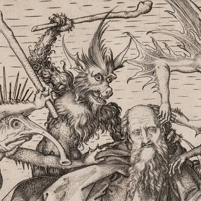 Die Peinigung des Heiligen Antonius gehört zu den frühen Stichen des Künstlers. Erstmals wird das Geschehen, das mit großer Erzählfreude und Detailreichtum vorgestellt wird, in die Luft verlegt. Der Heilige duldet in stiller Demut die Attacken von neun ihn umringenden Dämonen, die virtuos aus verschiedenen tierischen Elementen zusammengesetzt sind.