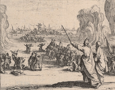 Dargestellt ist das sogenannte „Meerwunder“. Unzählige Künstler hat diese Geschichte inspiriert. Moses und die Israeliten sind auf der Flucht vor den Ägyptern. Am Ufer des Roten Meeres haben die Streitkräfte des Pharao sie fast eingeholt. Da hilft Gott seinem Volk durch ein Wunder. Das Wasser des Meeres teilt sich und die Israeliten gelangen trockenen Fußes ans andere Ufer. Das ägyptische Heer ertrinkt in den Fluten.