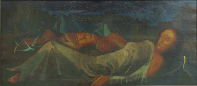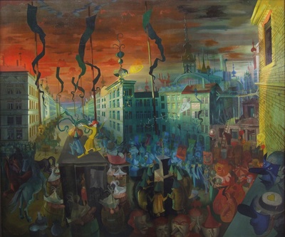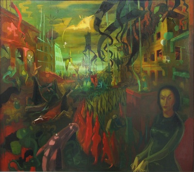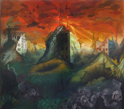 Für das Triptychon entwickelte der Maler fantastische Motive in der Tradition eines Hieronymus Bosch. Als erstes malte er 1935 die linke Tafel mit dem Titel "Karneval". Dazu Grundig: "Die Straßenzüge einer riesigen Stadt, die in blutrotem Himmel zu verbrennen schien. Irrsinnig gewordene Menschen und Masken durchzogen die Straßen, sich selbst und andere belügend. Nur im linken Bildwinkel standen noch die Kommunisten, nicht wankend und unerschütterlich."